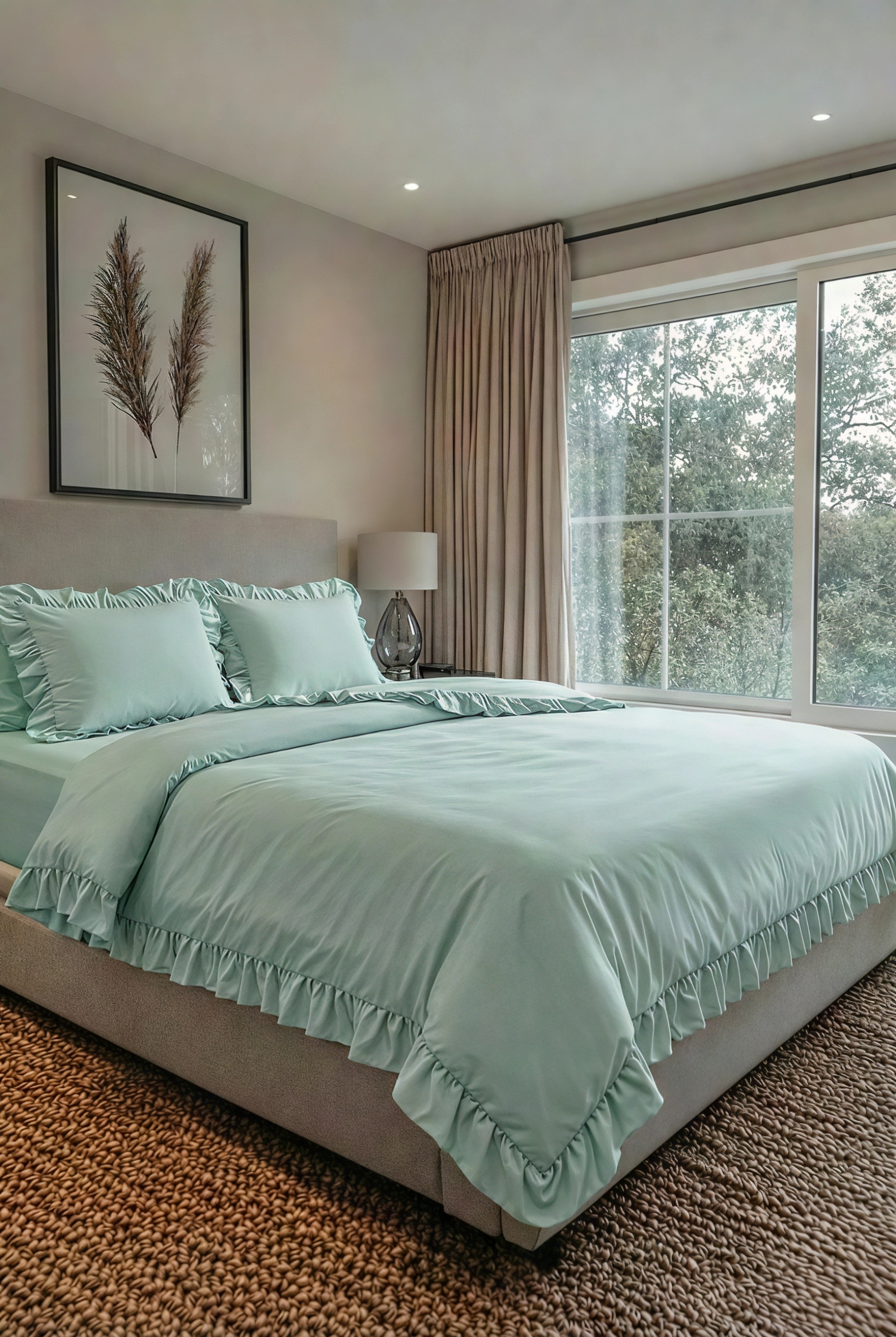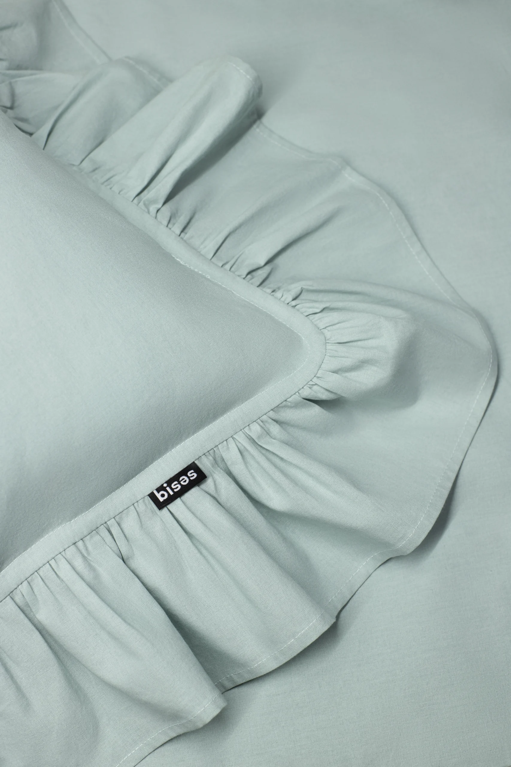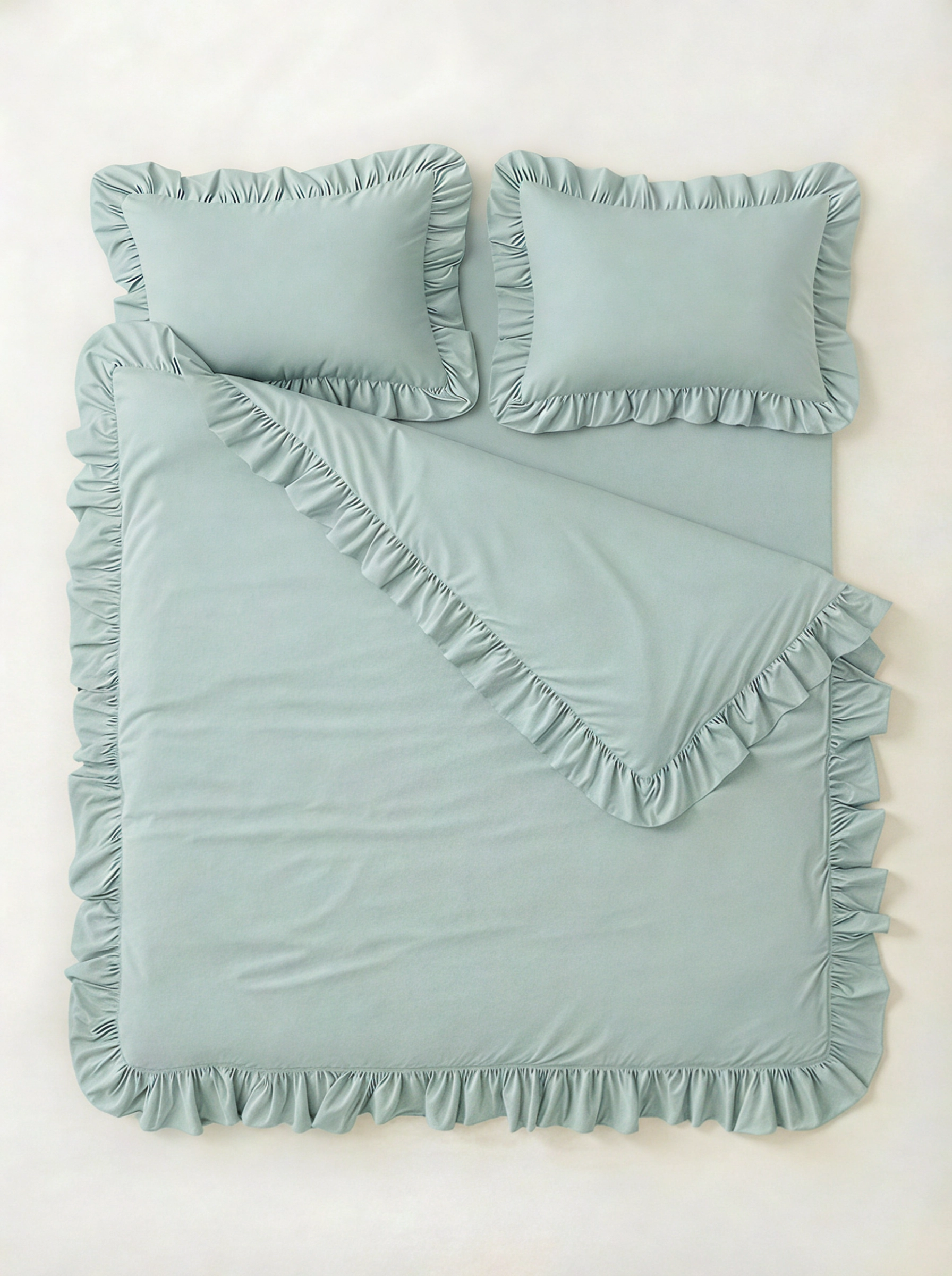 Ця колекція постільної білизни з вареної бавовни преміальної якості передає баланс між чистотою форми, натуральністю матеріалів і витонченістю дотику. Делікатні рюші по периметру додають комплекту об’єму, м’якості та елегантного характеру.