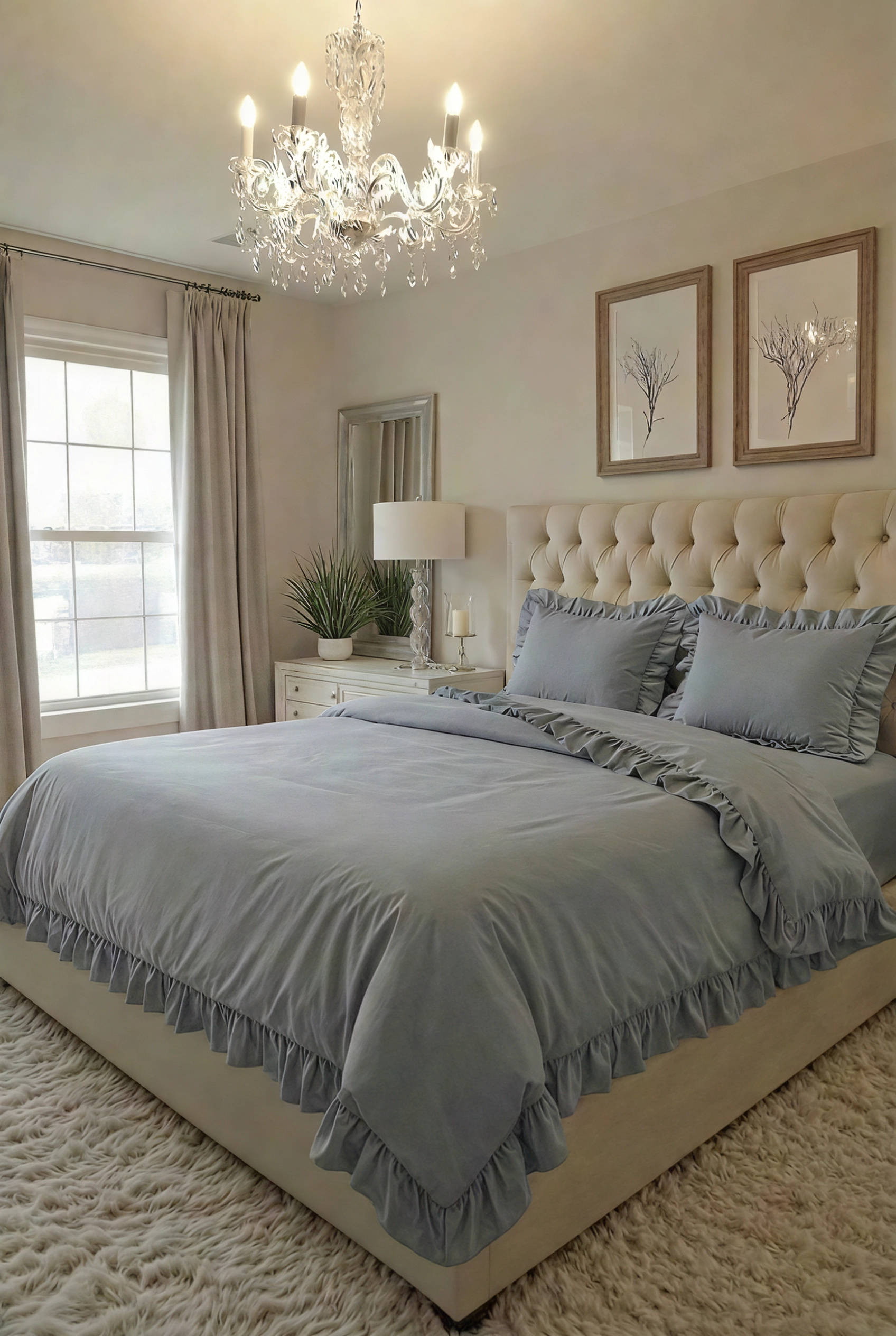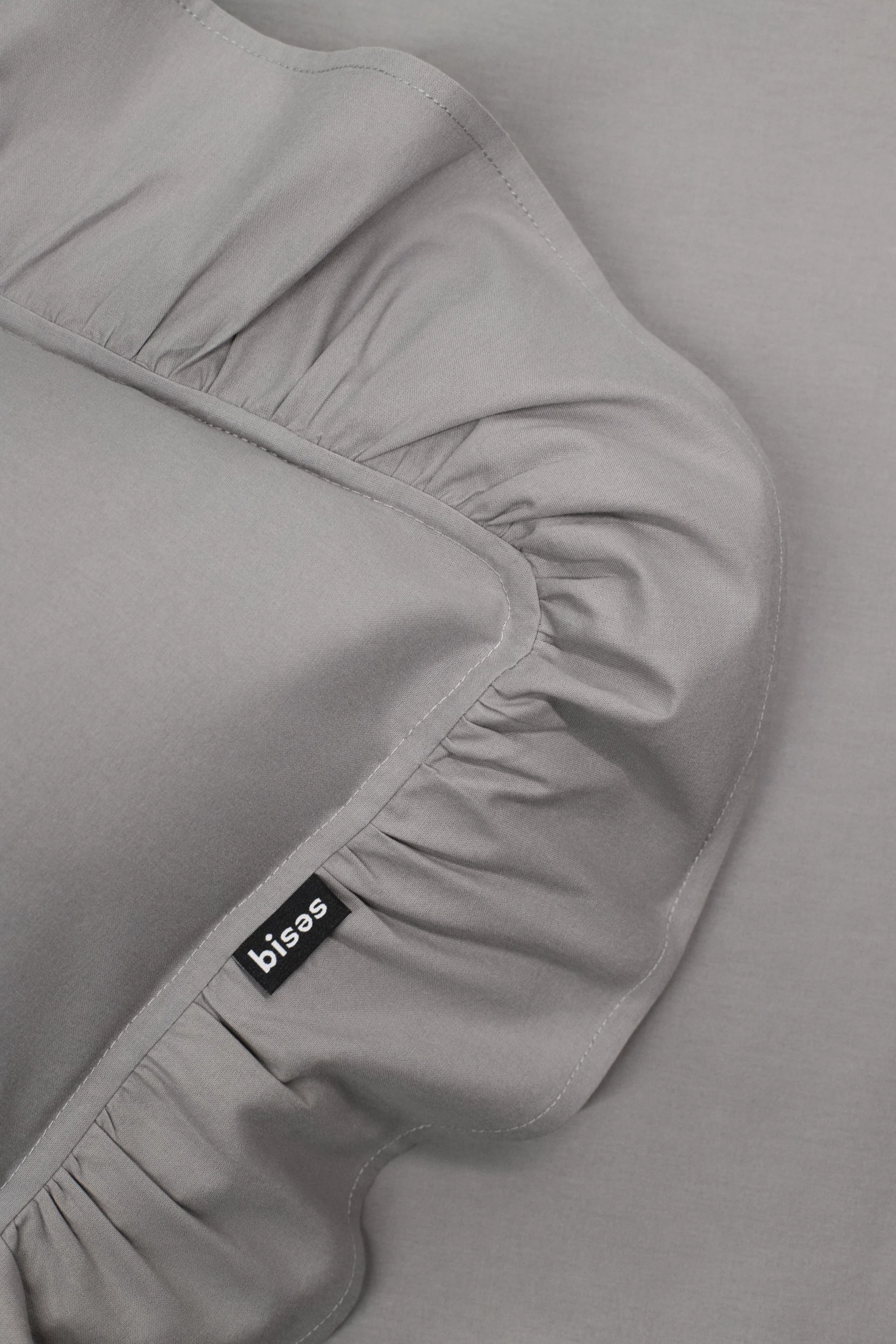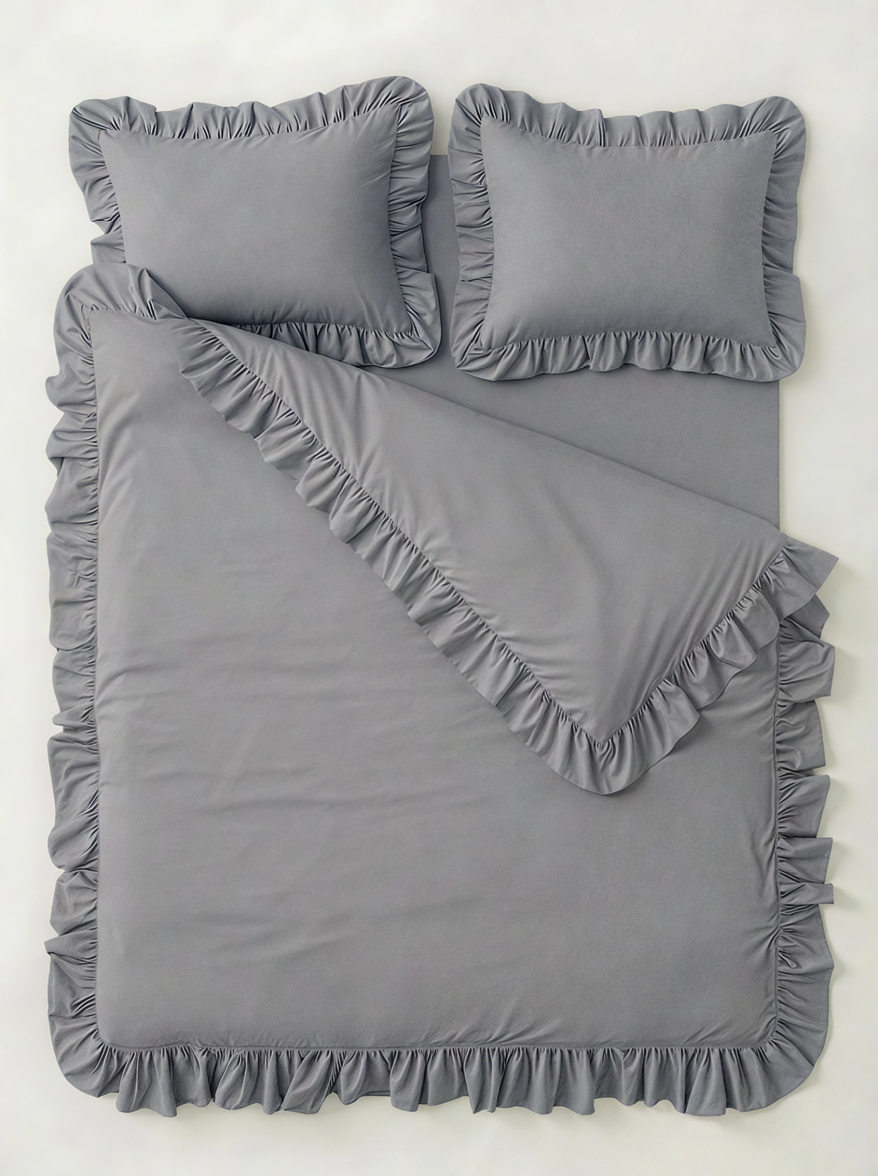 Ця колекція постільної білизни з вареної бавовни преміальної якості передає баланс між чистотою форми, натуральністю матеріалів і витонченістю дотику. Делікатні рюші по периметру додають комплекту об’єму, м’якості та елегантного характеру.