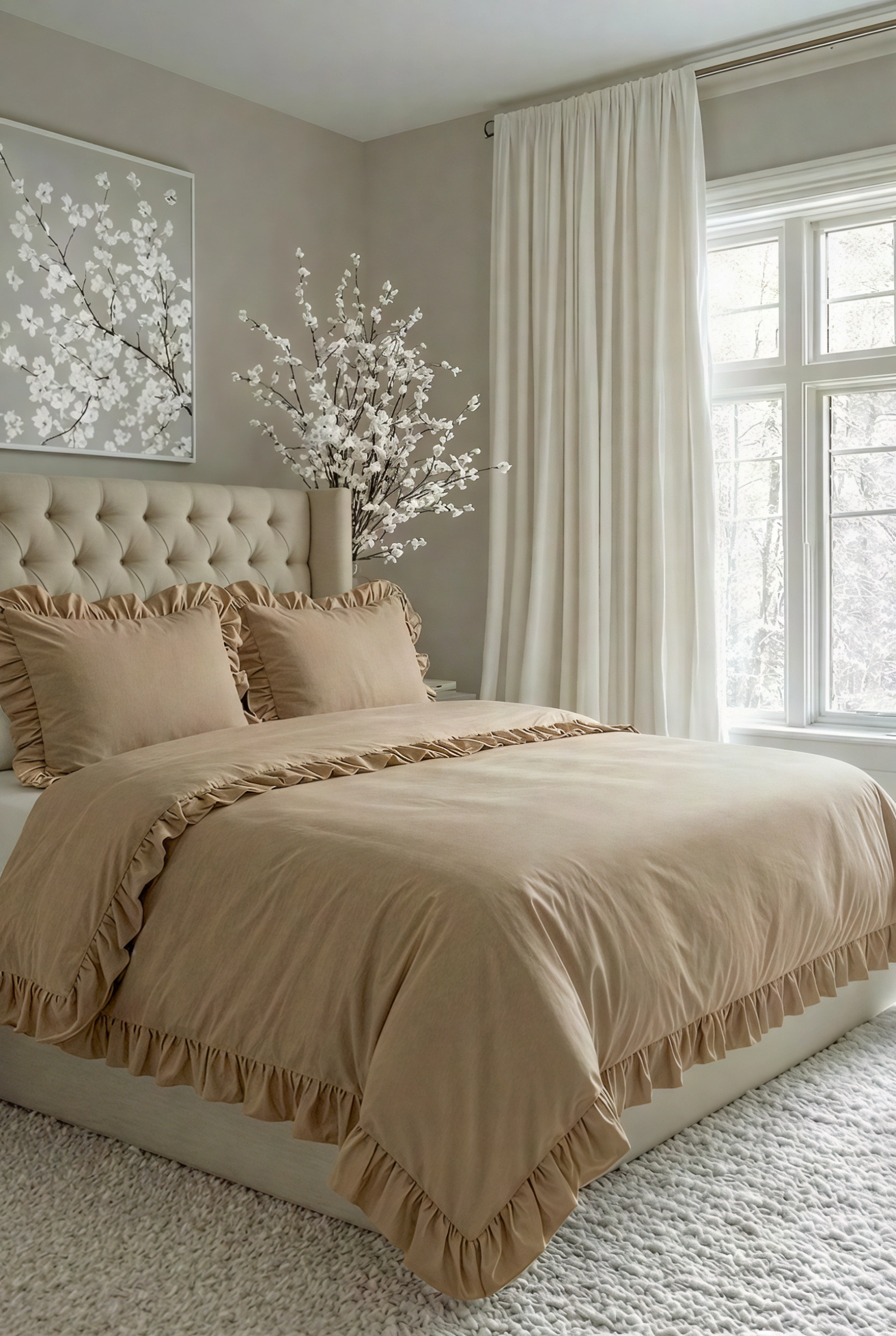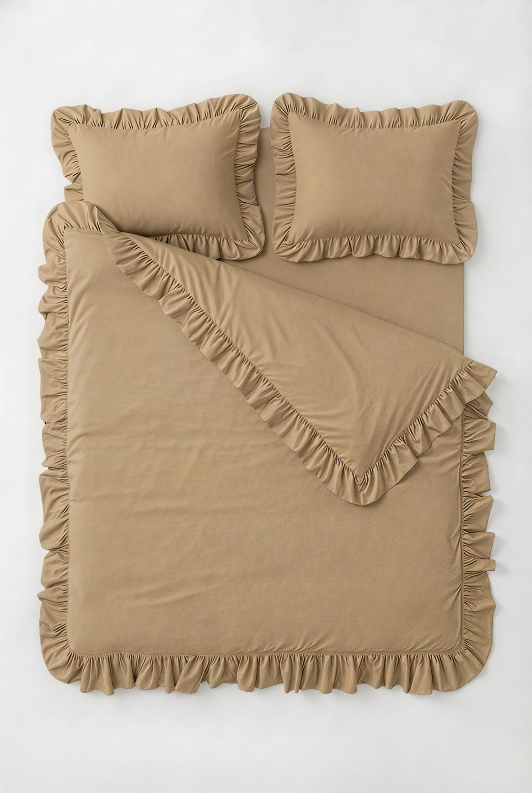 Ця колекція постільної білизни з вареної бавовни преміальної якості передає баланс між чистотою форми, натуральністю матеріалів і витонченістю дотику. Делікатні рюші по периметру додають комплекту об’єму, м’якості та елегантного характеру.